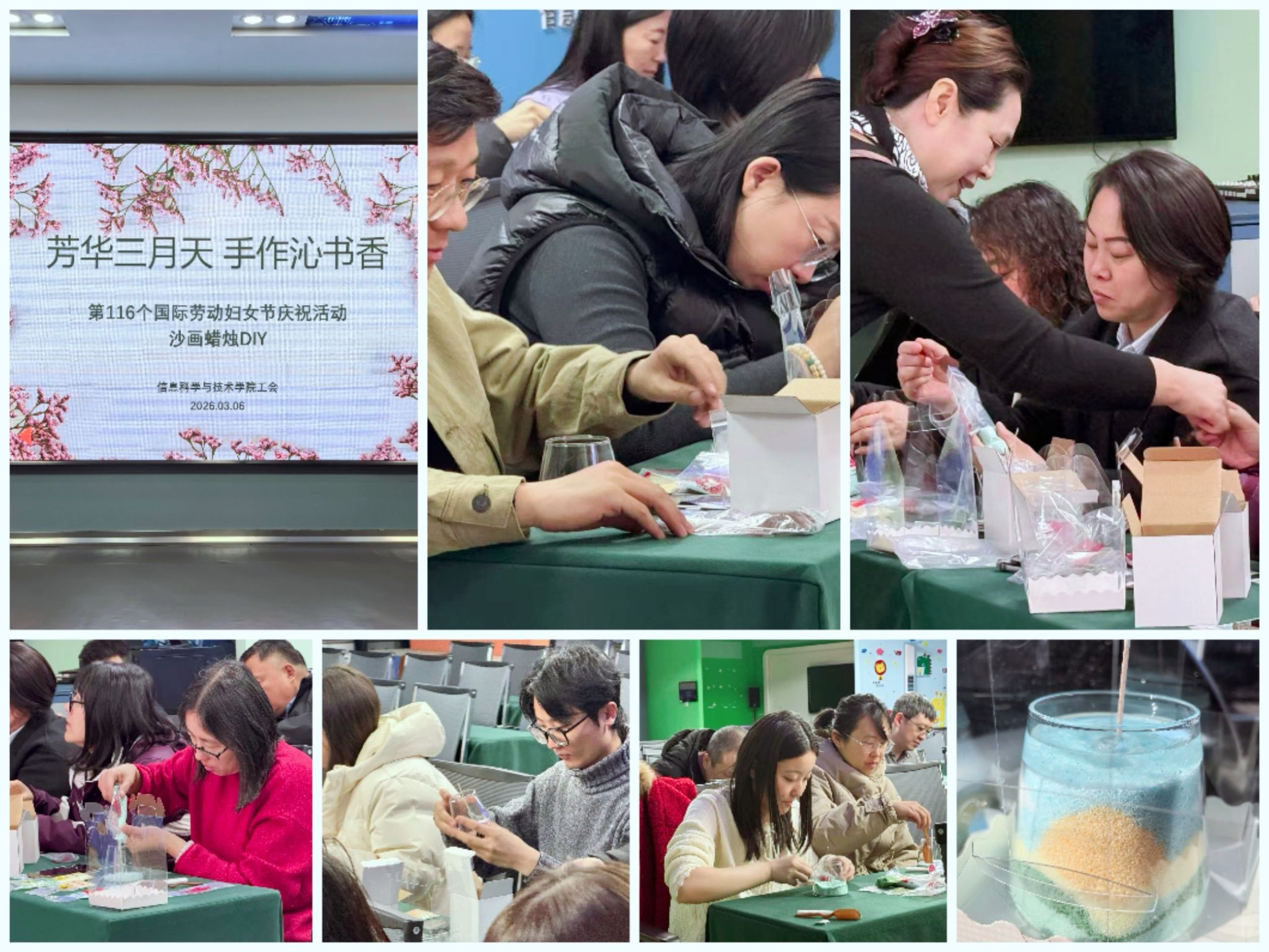 为庆祝第116个国际劳动妇女节,进一步丰富教职工文化生活、致敬巾帼力量,近日信息科学与技术学院工会在214报告厅精心组织了一场沙画蜡烛手作活动,全院教职工以指尖匠心邂逅春日浪漫,共同度过了一个温馨的节日。